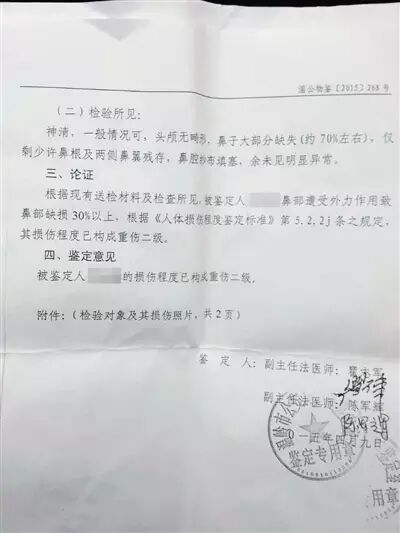 温州市公安局物证鉴定室于去年4月7日出具的《法医学人体损伤程度鉴定书》显示,李云鼻子自鼻梁中段以下缺损,鼻子大部分缺失(约70%左右),仅少许鼻根及两侧鼻翼残存。根据《人体损伤程度鉴定标准》相关规定,鉴定意见为李云的损伤程度已构成重伤二级。